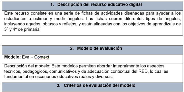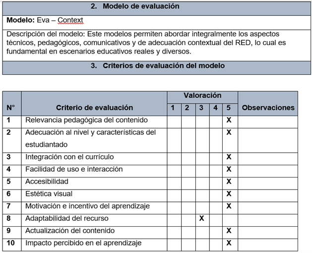El modelo EVA-Context permite una evaluación adecuada de un recurso educativo digital (RED) porque integra criterios pedagógicos, técnicos y contextuales, ofreciendo una mirada holística y realista del recurso. A diferencia de modelos que se centran únicamente en aspectos tecnológicos o pedagógicos, EVA-Context considera dimensiones como la motivación del estudiante, la facilidad de uso, la accesibilidad, el impacto en el aprendizaje y la pertinencia del recurso en función del contexto institucional y del perfil del estudiantado.