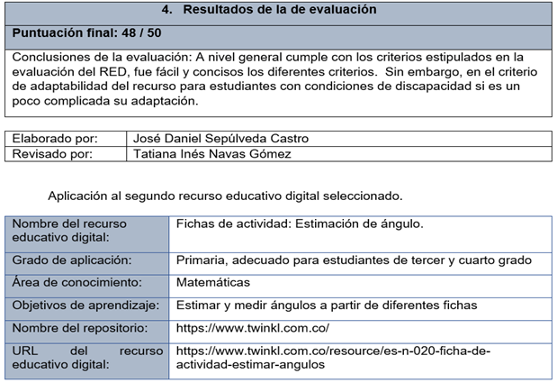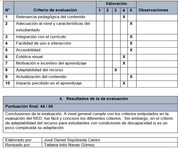 A continuación, se evidencia la aplicación del instrumento de evaluación rediseñado a dos recursos educativos digitales RED.