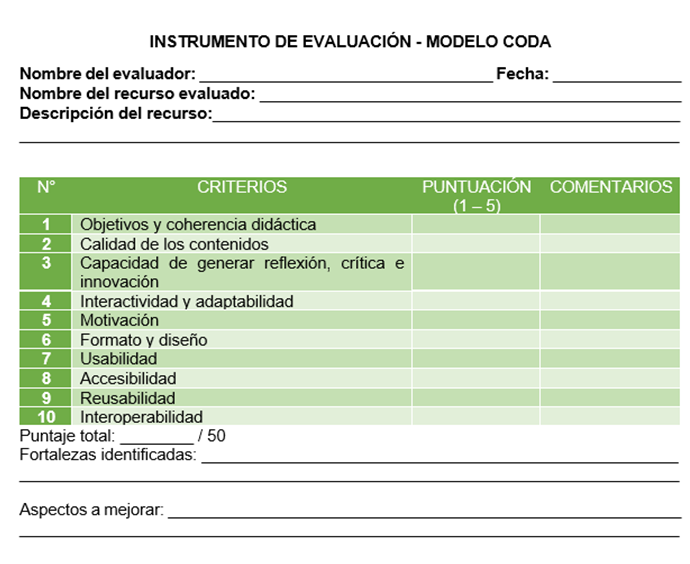 El instrumento de evaluación de CODA consiste en un formulario que incluye los diez criterios mencionados, cada uno con sus respectivos subcriterios. Este formulario permite registrar las puntuaciones asignadas a cada criterio y proporciona espacio para comentarios adicionales.