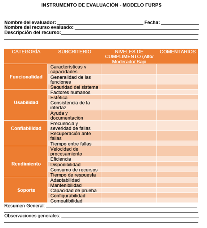 El instrumento de evaluación basado en FURPS consiste en una rúbrica que incluye los cinco criterios principales, cada uno con sus respectivos subcriterios. Se asignan puntuaciones según la escala de valoración mencionada anteriormente.