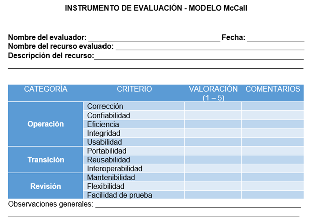 La evaluación según el modelo de McCall se realiza mediante una lista de verificación o checklist que contiene preguntas o afirmaciones relacionadas con cada criterio. Los evaluadores califican cada ítem según la escala establecida, y los resultados se analizan para identificar áreas de mejora en el RED.