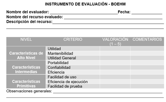 Para aplicar el modelo de Boehm en la evaluación de recursos educativos digitales, se puede utilizar una plantilla que incluya:
