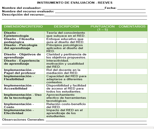 - Criterios de implementación: Evalúan la calidad de la implementación del RED, abarcando el papel del profesor, la flexibilidad del RED, la accesibilidad, el uso de la tecnología, el costo y la efectividad del RED.