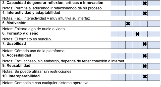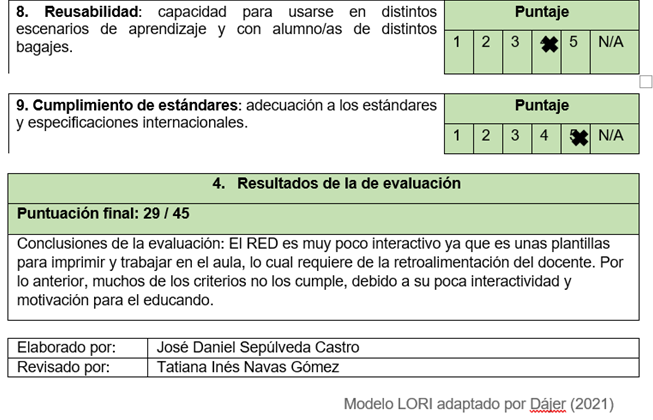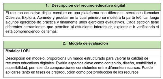 Además, el modelo LORI es altamente flexible y puede ser adaptado fácilmente al tipo de RED que se quiera evaluar, ya sea una aplicación web, un recurso multimedia, una infografía interactiva o un software de simulación. Esto permite que el docente tenga un marco de referencia claro y estandarizado para comparar diferentes recursos y seleccionar aquellos que verdaderamente contribuyen al logro de los objetivos de aprendizaje establecidos en el plan de estudios. Dado que se cuenta con acceso a internet en la institución, se amplía la posibilidad de explorar e integrar diferentes herramientas digitales en la práctica pedagógica, por lo que se hace aún más necesario contar con criterios objetivos para evaluar su pertinencia y calidad.