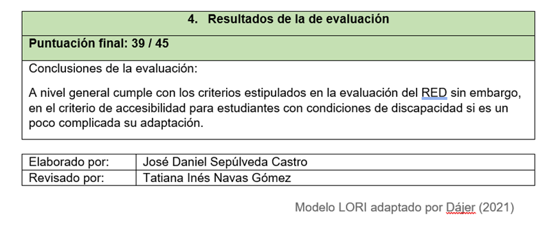 Finalmente, el uso del modelo LORI también representa una oportunidad de crecimiento profesional para el docente, al permitirle fundamentar técnicamente y pedagógicamente sus decisiones respecto a la incorporación de tecnologías en el aula. Este modelo no solo apoya la innovación educativa, sino que también ofrece una base para la sistematización de experiencias, la reflexión sobre la práctica y la posible participación en proyectos institucionales relacionados con el uso pedagógico de las TIC. En consecuencia, LORI no solo es una herramienta útil para la evaluación, sino también una vía para fortalecer la práctica docente y el aprendizaje de los estudiantes.